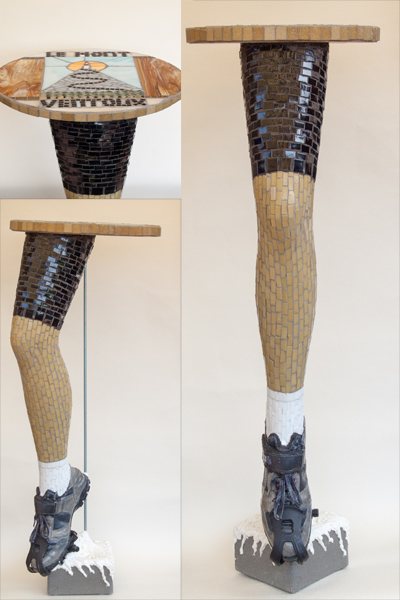 Van een etalagebeen, een trapper, de toeclip en mijn fietsschoen heb ik dit fietsbeen gemaakt. Op het plateau aan de bovenzijde staat het logo van de Mont Ventoux een van mijn favoriete bergen, die ik meerdere malen met veel plezier zelf beklommen heb. |