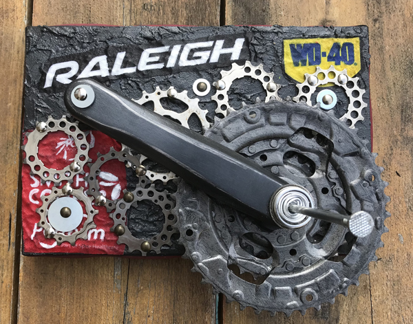 De zit, de wind en de snelheid ze maken me fanatiek en geven me het gevoel dat ik vlieg. De fietskriebel hebben we ook aan onze kinderen doorgegeven en in een huis met 5 fanatieke fietsers moet er wel eens een fietsonderdeel of een binnenbandje vervangen worden. Weggooien ik dacht het niet, er wordt al zoveel weggegooid. De onderdelen flink oppoetsen, wat humor en creativiteit toevoegen en zo ontstonden de ReCycles. De achtergrond is bewust zwart gemaakt, dit staat symbool voor modder en de smeerresten. De binnen- of buitenband werken de recycles mooi af. ( Liever een een ReCycle met een andere achtergrondkleur? Op verzoek maak ik ze ook in een gewenste kleur).
