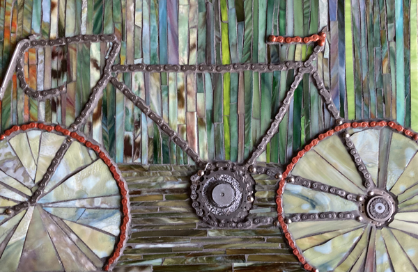 Fietsonderdelen gelegd in diverse kleuren groen glas. De Fiets is gemaakt van fietskettingen en de rem van een bandenlichter.